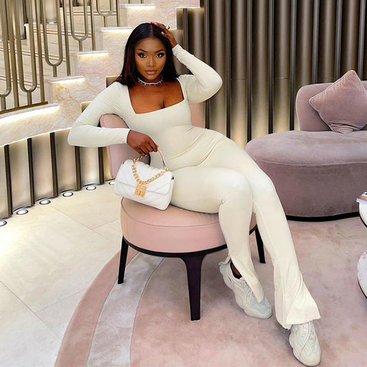 Solid Color Cut-out Deep V Casual Jumpsuit