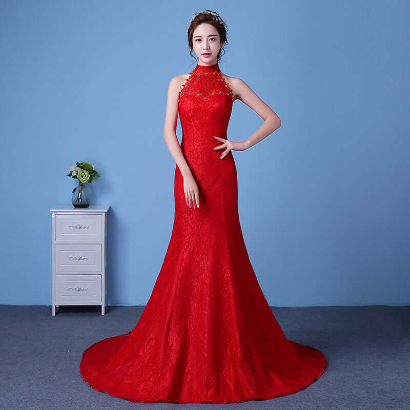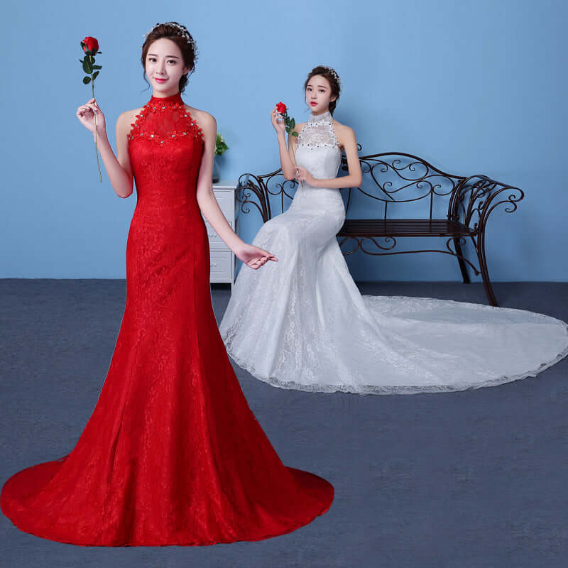 Big red wedding dress bride large size waist fishtail wedding dress palace fishtail tail Korean hanging neck